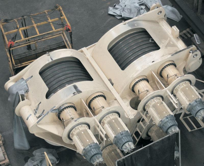 绞车轴线相对于彼此以一定的角度安装,使得钢绳在两个滚筒之间无偏移角度。这防止了钢丝绳的旋转,减少了钢丝绳的疲劳,因为钢丝绳中没有扭转的积累。滚筒设有硬化和带槽的套筒,以防止滚筒表面的磨损。槽的直径随着每个缠绕而增加以应对拉紧时钢丝绳的弹性伸长。